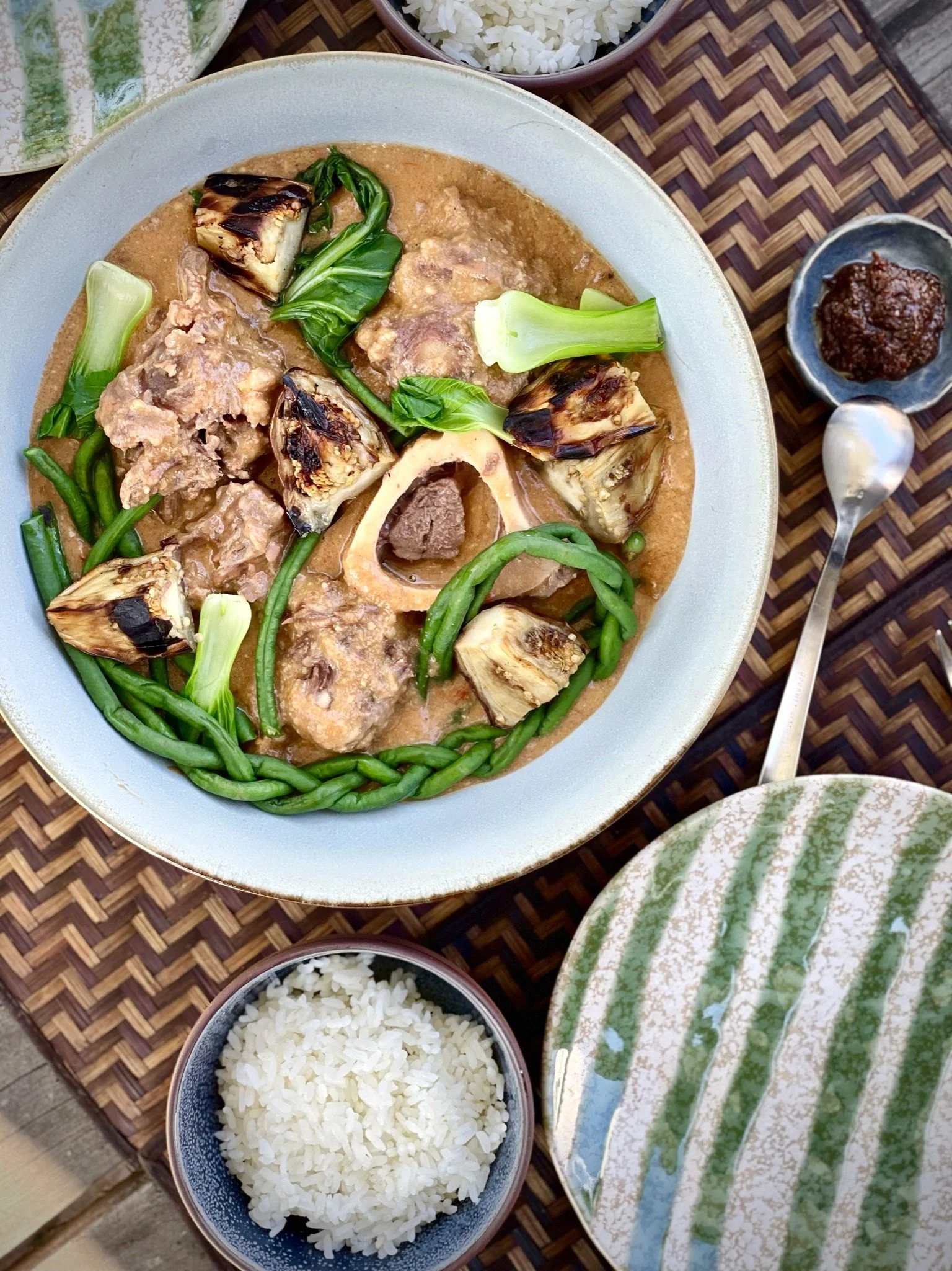 KARE KARE is typically an oxtail and tripe stew, thickened with toasted rice and peanuts crushed in a mortar and pestle. It’s got a bit of an orange color due the the addition of atsuete or annatto seeds. Our version uses a collagen heavy oxtail broth, supercharged by beef shank with marrow. We also use both cashews and peanuts. We love this dish with tons of veggies too. Our favorites are long beans, eggplant 🍆 and bok choy 🥬. We are serving this with Bagoong and steamed rice 🍚.