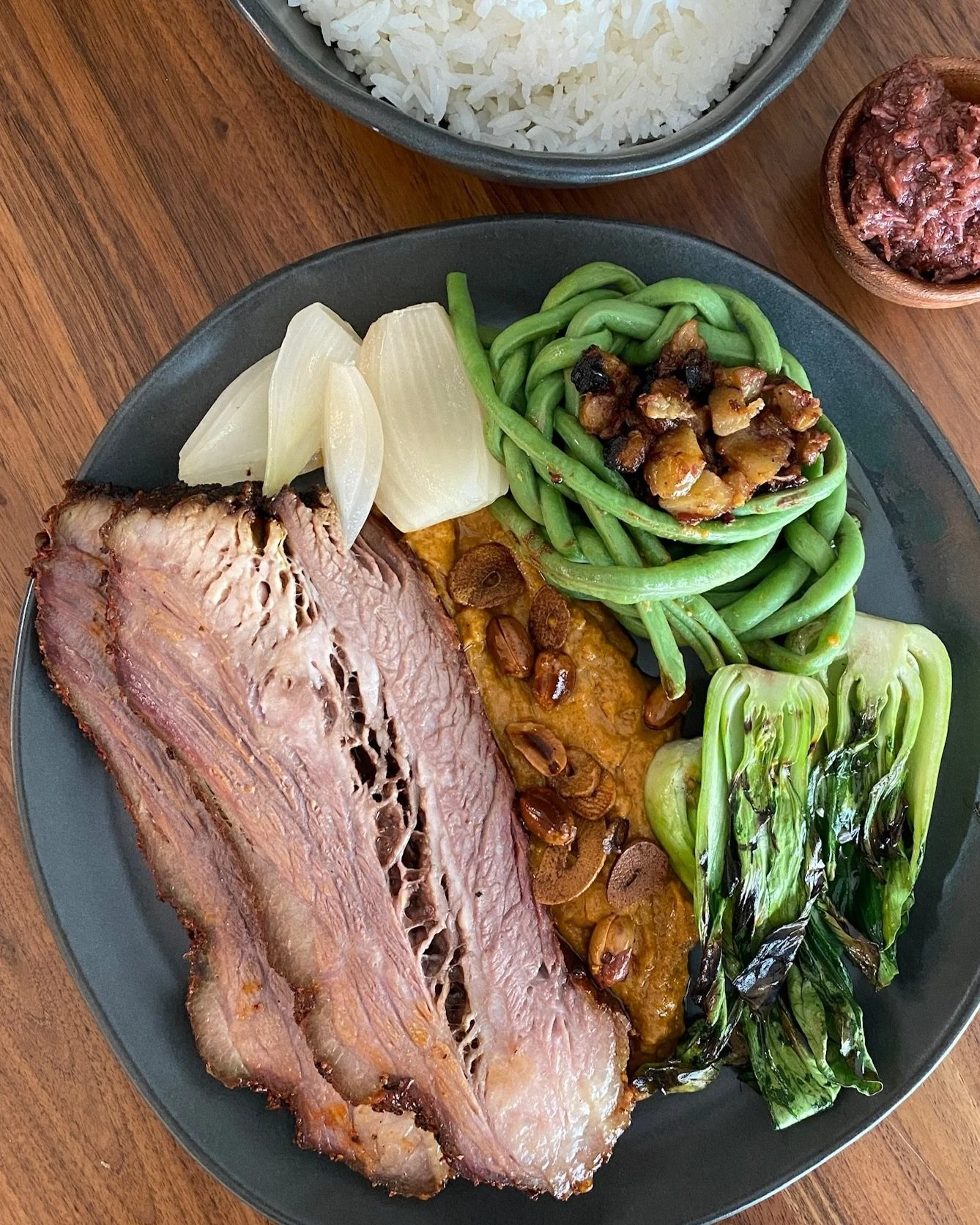 Between Brady’s food obsession and his son’s culinary brain, they experimented with a beloved American BBQ favorite to take center stage in an iconic Filipino dish. The layering and infusing of flavors into the protein was the direct result of some quality father and son time in the kitchen. The new family recipe couldn’t be complete without guidance from the person Brady learned from, his mom. In-person and over FaceTime, cooking food together has been valuable bonding time between Brady and his mom. Her recipe and intricate methods for Kare Kare provide the solid foundation for which the annatto rubbed smoked brisket can shine.