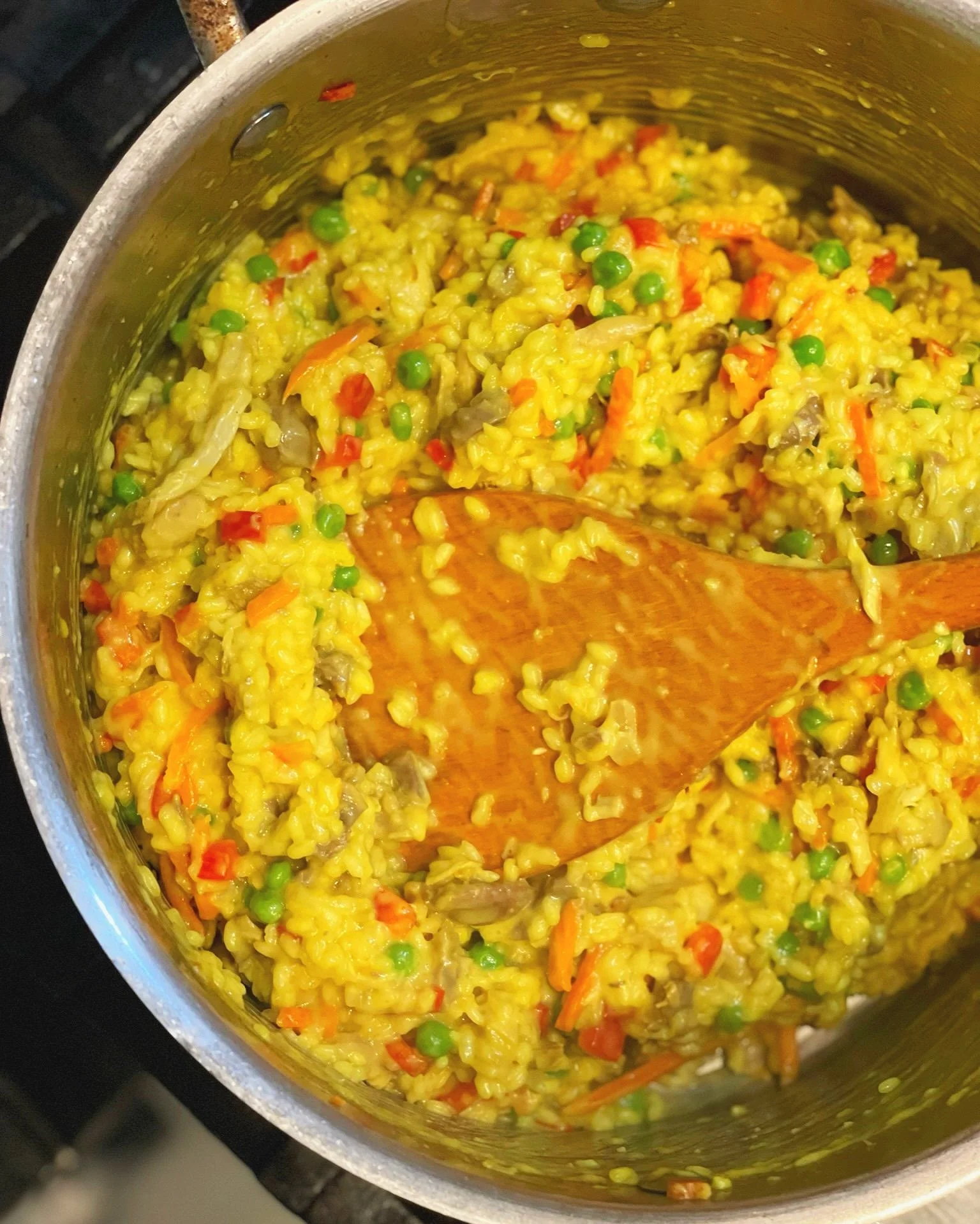 NOTE: Do not leave the rice unattended, stirring constantly prevents the rice from sticking to the bottom of the pan and also helps release the starch which will help thicken the Bringhe to give it a creamy texture.