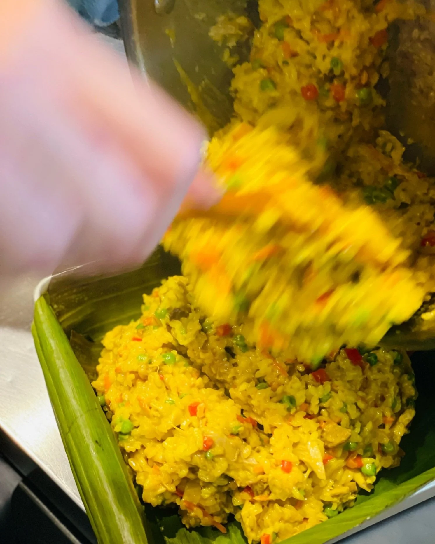 To soften the banana leaves so you can mold it to your serving bowl or sheet pan, gently run it over your stove’s open flame. Line a serving bowl or a 10 x 10 sheet pan with banana leaves. While the rice is still warm, transfer the Bringhe into the pan and distribute evenly. Fold the banana leaves over the Bringhe until ready to serve. When ready to eat, uncover the banana leaves and serve.
