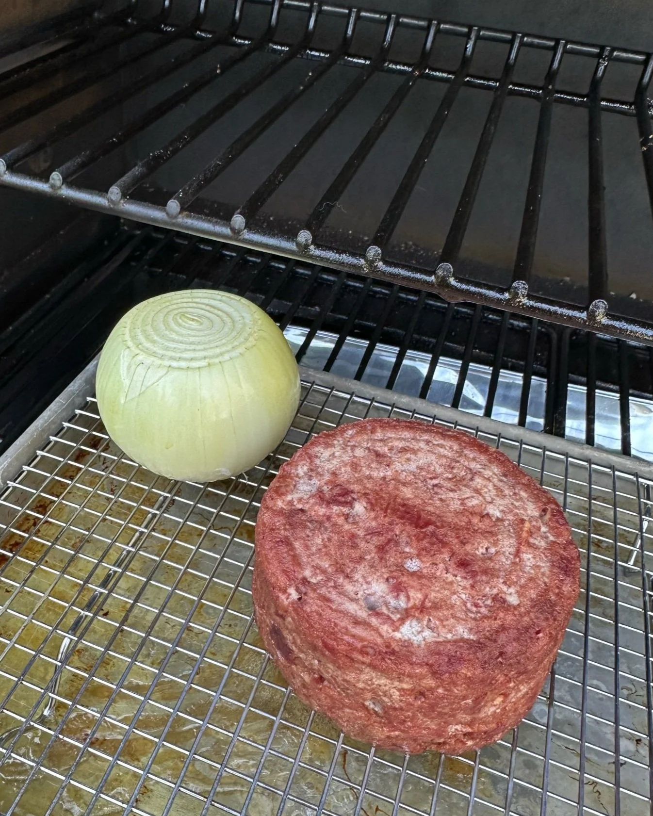 Set the smoker to 235ºF. It takes about 15 minutes to get the smoker to the desired temp using a Traeger Grill. Place the Onion and the Corned Beef on a tray with a wire rack for about 5 hours then remove and set aside until ready to cook.