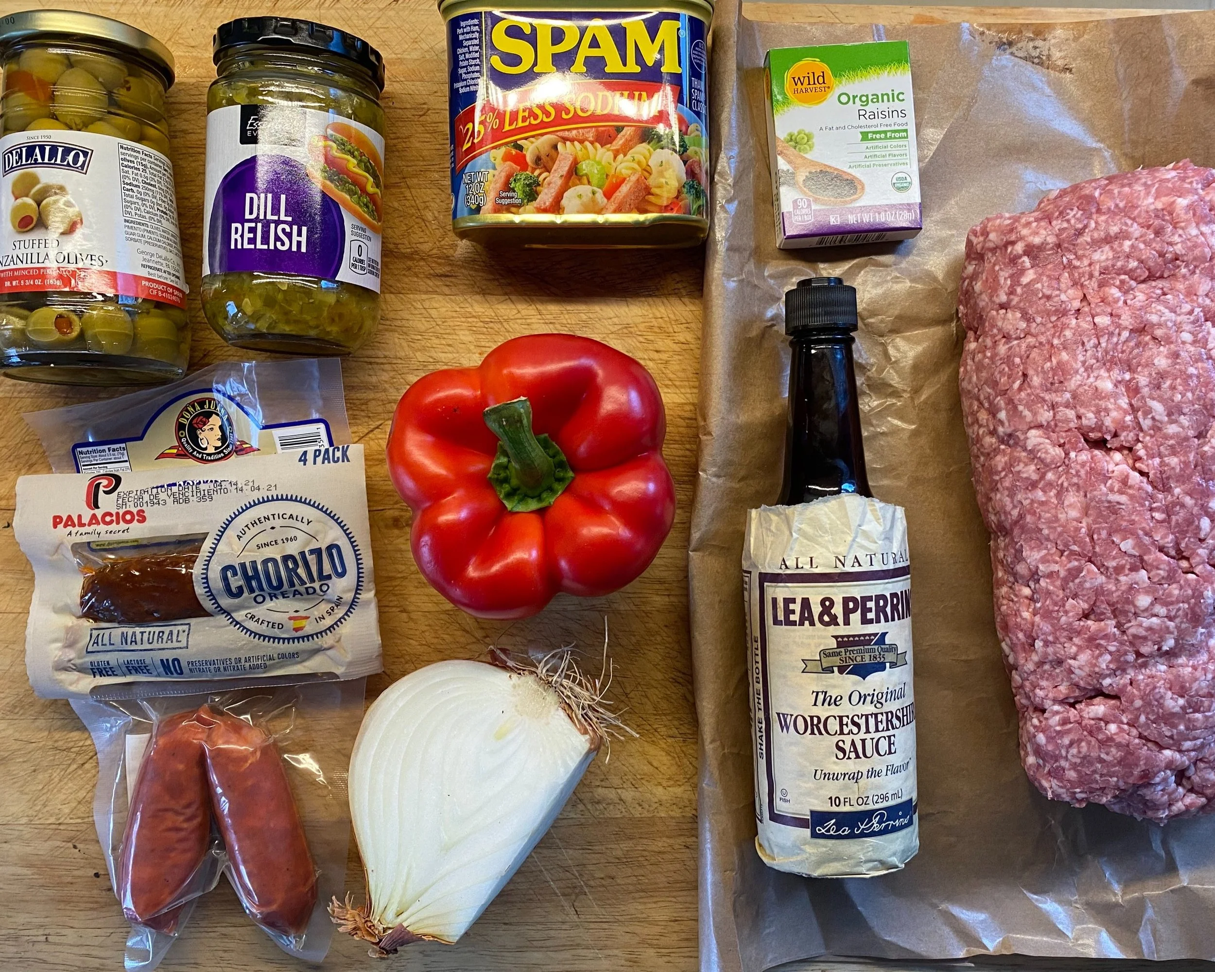 In Spain and Portugal, Embutido typically refers to a cured sausage. In Philippine cuisine, it’s a meatloaf that represents the colonial influence of Spain and the US. It has the smoky Spanish chorizo and the ubiquitous Spam that made its way to the Philippines via the American occupation during the war. It also includes olives, raisins and when used as a stuffing for Chicken Relleno, it can also include hard boiled eggs. All of the above is mixed with ground pork, shaped into a log, wrapped in foil and is steamed or baked.