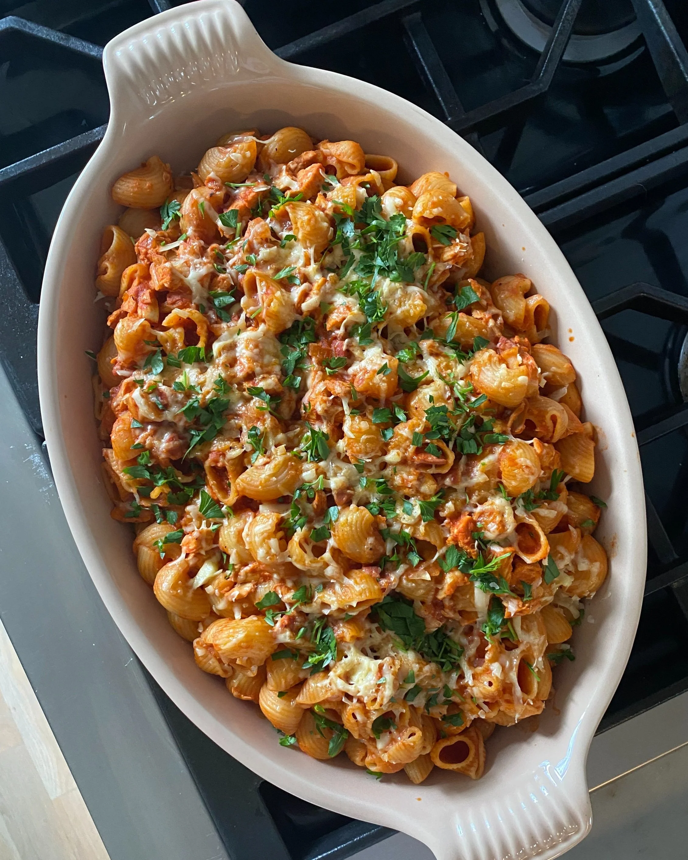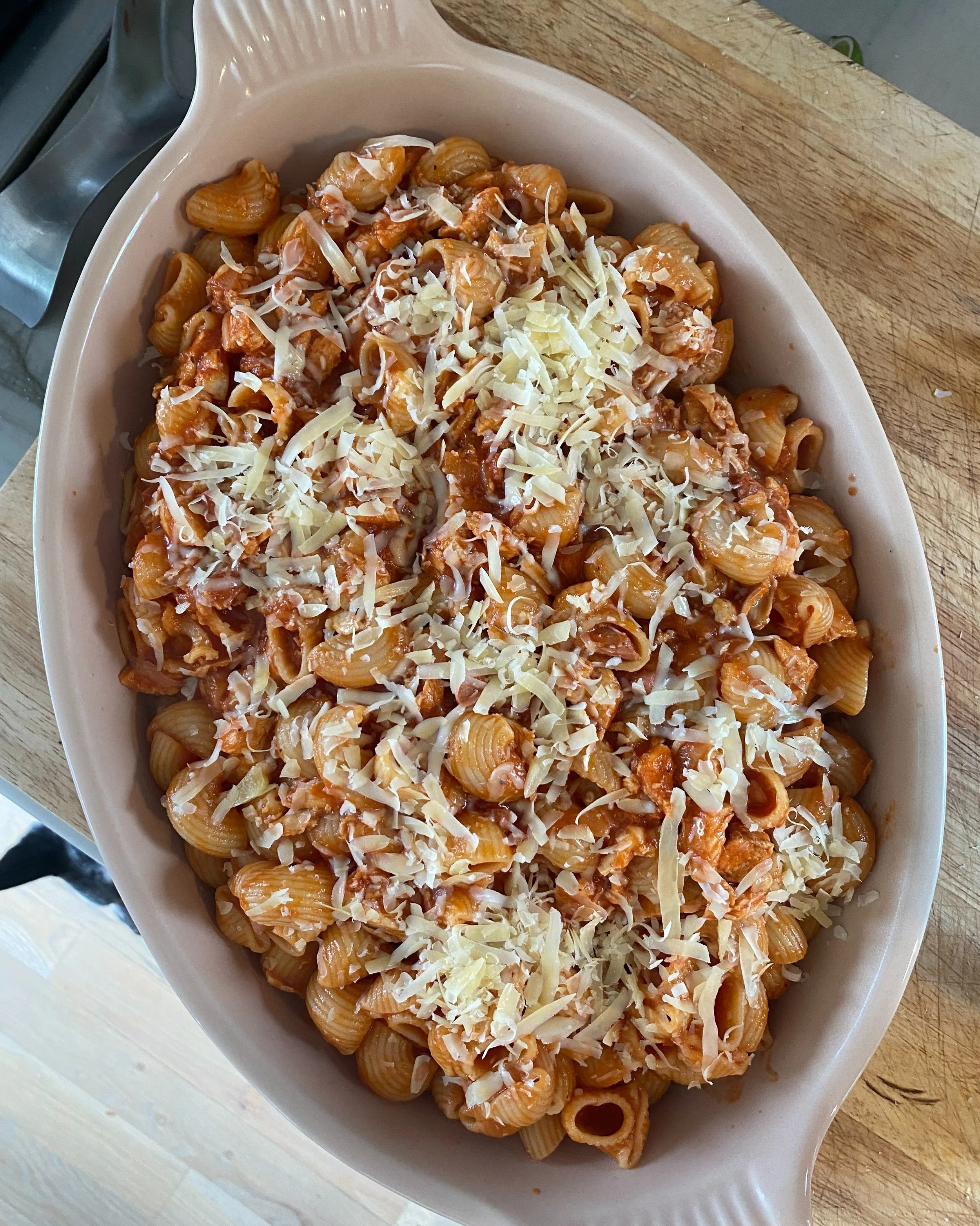 NOTE: It is my personal preference to have a saucier dish so I only leave this in the oven until the cheese melts and I take it right out. Leaving it for too long can bake it and also achieve crispy bits which is good too but I prefer a saucier pasta. This is up to you and your personal preference.
