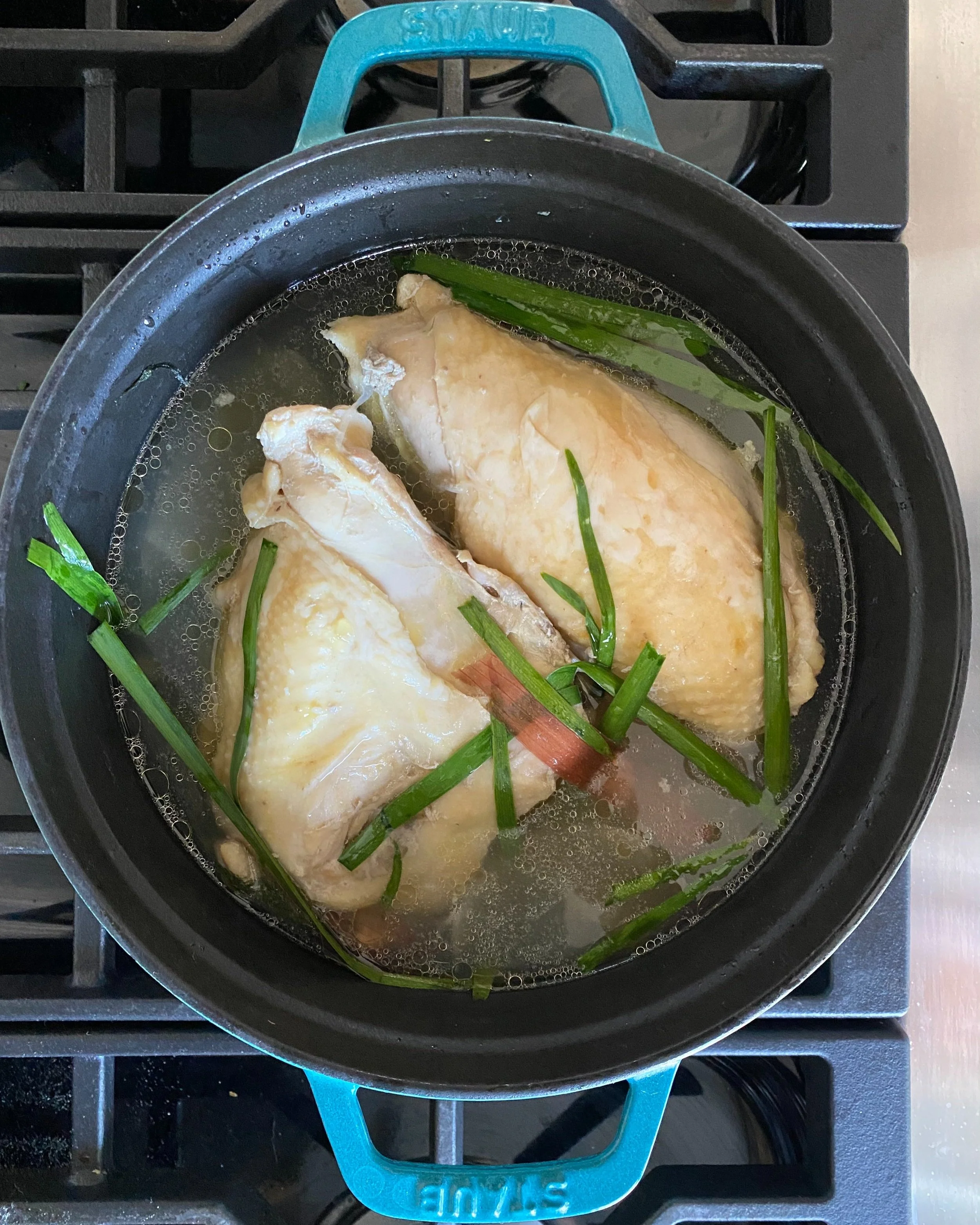 In a stock pot, place the chicken breast, scallions, salt and pepper and enough water to just cover the chicken. Bring this to a low simmer until chicken is cooked. Skim any impurities from the broth.