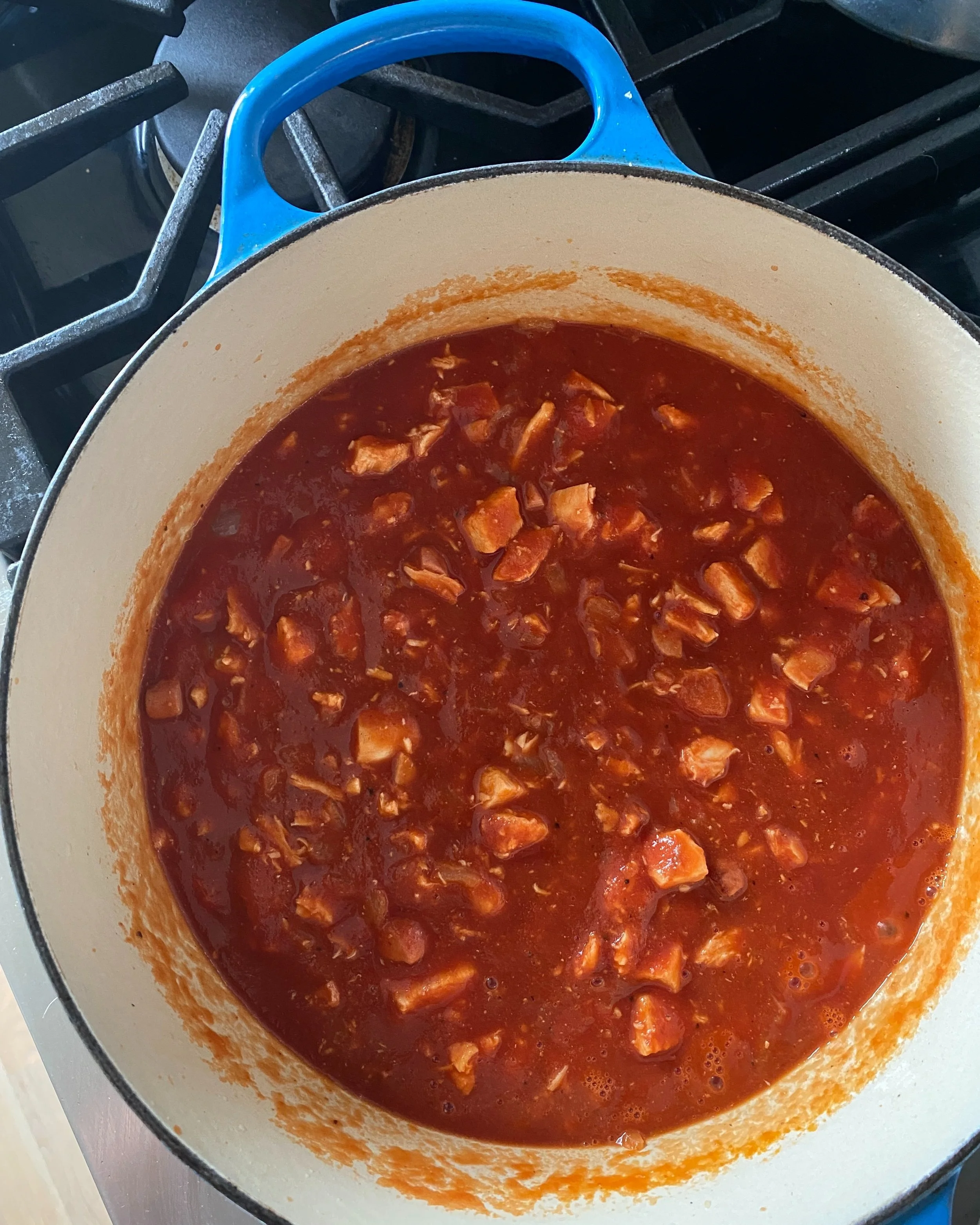 In a dutch oven or a stock pot, heat on up 2 tbsp of oil on medium high heat. When hot, add the Vienna sausage and sauté until browned. Lower the heat to medium and add the onion, cooking it until translucent (2-3 minutes). Check to see if more oil is needed and add as necessary to ensure the pan isn’t dry. Add the chicken and incorporate into the mixture then add the tomato sauce. Depending on how thick the tomato sauce is (this varies), you can add some water into the can and thin out the sauce as needed.